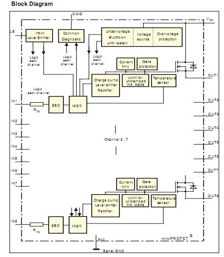 BTS4880R features: (1)Output current 0,625 A per channel; (2)Short circuit protection; (3)Maximum current internally limited; (4)Overload protection; (5)Input protection; (6)Overvoltage protection (including load dump); (7)Undervoltage shutdown with auto restart and hysteresis; (8)Switching inductive loads; (9)Thermal shutdown with restart; (10)Thermal independence of separate channels; (11)ESD - Protection; (12)Loss of GND and loss of Vbb protection; (13)Very low standby current; (14)Reverse battery protection; (15)Programmable input for CMOS or Vbb/2; (16)Common diagnostic output ( current output ) for over temperature.